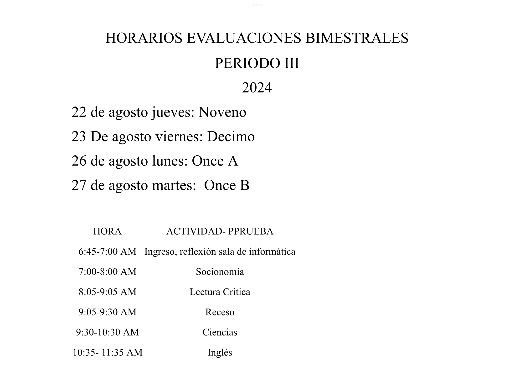 Estudiantes, les comparto el horario de evaluación bimestral en este tercer periodo.
