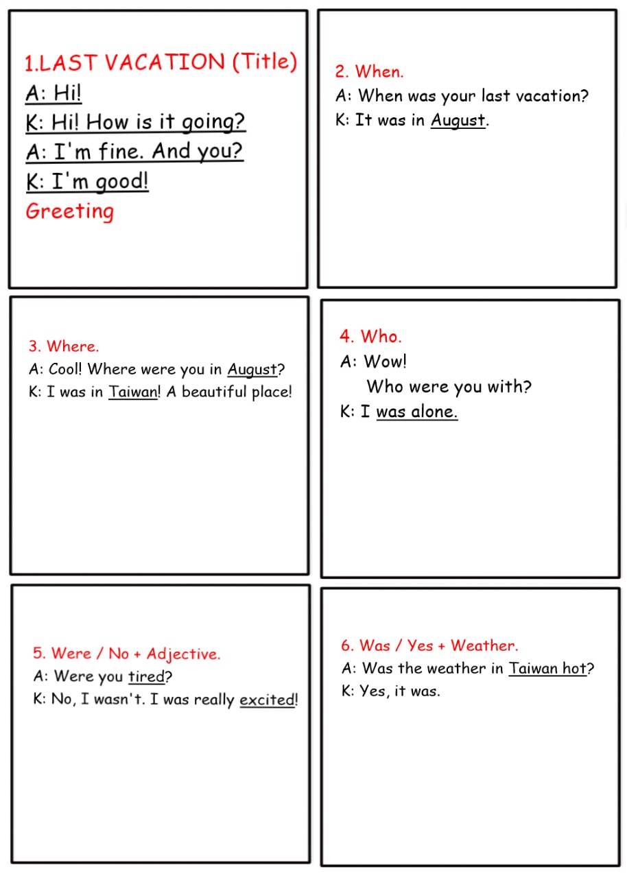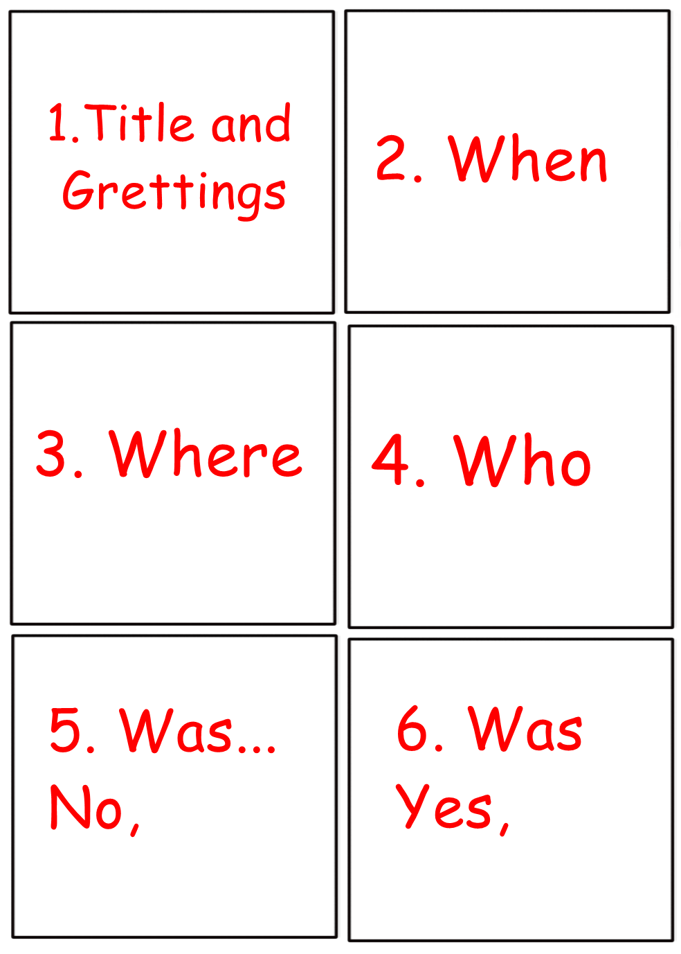 Por medio de esta, escribo para solicitar dos octavos de cartulina (pueden ser de cualquier color) para el dia Lunes. Realizaremos un Comic y un Poster. La cartulina del Comic debe estar previamente dibujada con los cuadrados, son 6 cuadrados, dejando espacio. (La muestra esta adjunta) Los niños que no han hecho el SCRIPT (guión) por favor realizarlo para traerlo listo el día lunes (Durante esta semana dedicamos tiempo para la realización del guión) Por cada cuadrado (viñeta) hay un pregunta especifica. (La muestra esta adjunta) El comic lo realizamos para el uso de las WH y YES/NO questions vistas en este bimestre.
