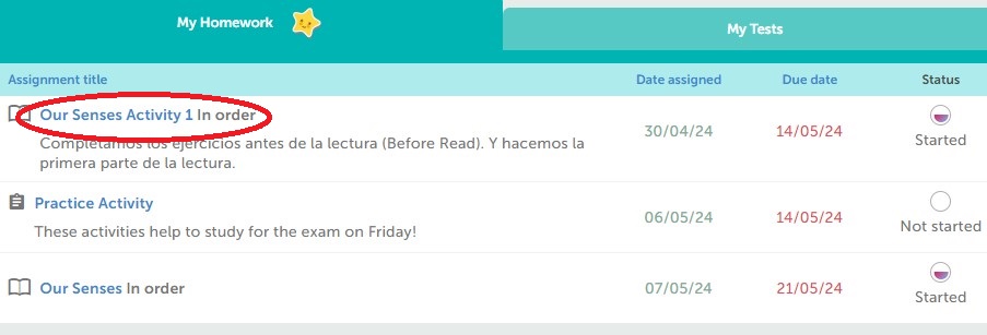 Continuaremos con la Lectura de Our Senses y realizaremos las actividades de Our Senses Activity 1 que encuentran en MY ASSIGMENTS.